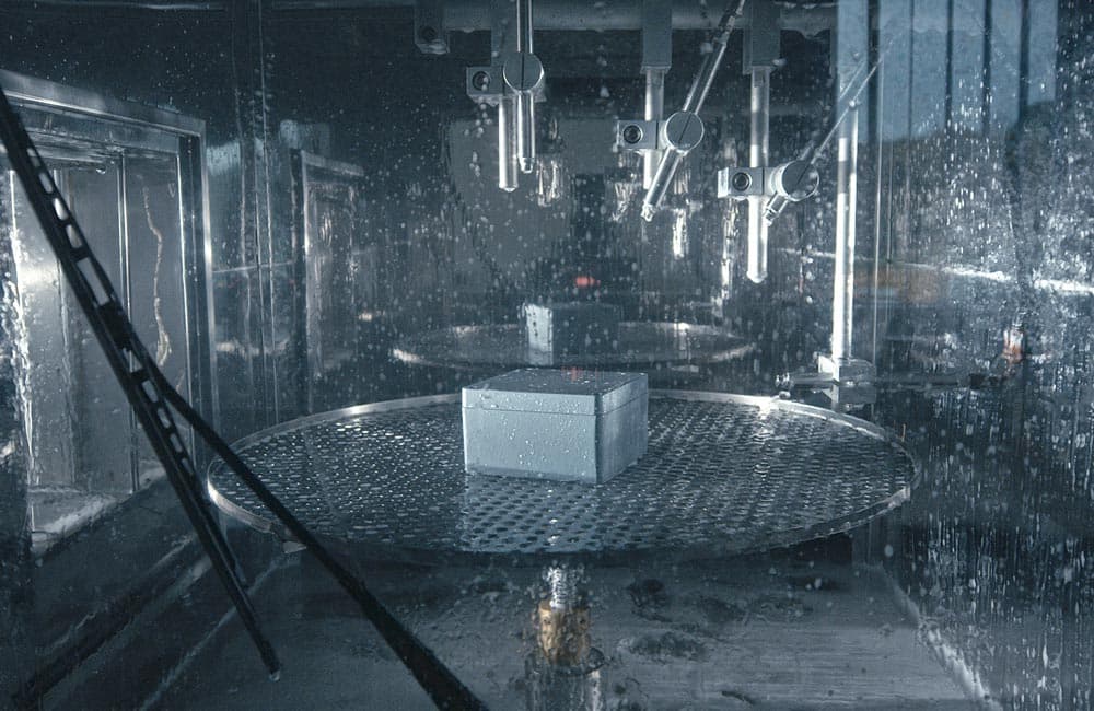 In unserer Salzsprühkammer erzeugen wir mit Salznebel eine korrosionsfördernde Atmosphäre. Unter diesen Bedingungen beschleunigt sich der Korrosionsvorgang im Vergleich zur Anwendung in der normalen Installationsumgebung. Somit können wir Schwachstellen der Gehäuse und Zubehörkomponenten vor dem Serieneinsatz feststellen und entsprechende Gegenmaßnahmen einleiten.